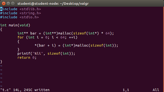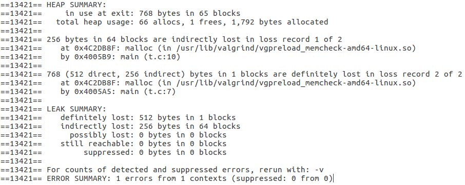 free(), najpóźniej na końcu działania programu. W przedstawionym przykładzie utworzono blok 64 wskaźników. Ponieważ wskaźniki mają rozmiar 8 bajtów, to 8 * 64 = 512.still reachable czy definitely lost.free()).W każdym przypadku podana jest ilość operacji alokowania i zwalniania pamięci. W ten sposób można sprawdzić, czy nie alokujemy/dealokujemy zbyt wiele razy.
