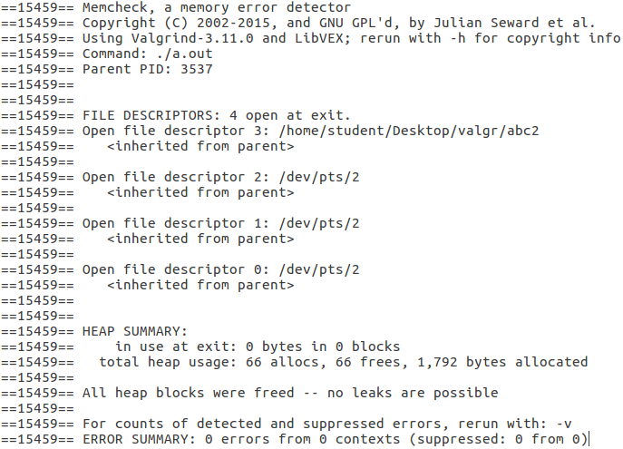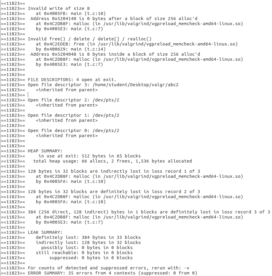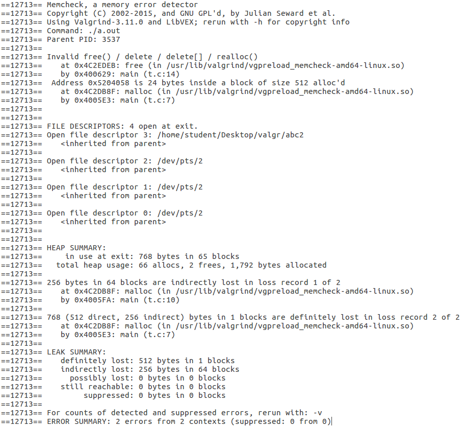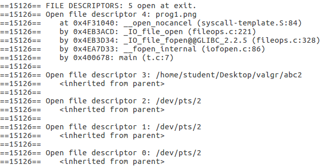 Jeżeli w trakcie pracy programu zostanie otworzony uchwyt do zewnętrznego zasobu (np. pliku), a nie zostanie poprawnie zamknięty, również pojawią się odpowiednie informacje. W razie wątpliwości, można uruchomić Valgrinda z parametrem –track-fds=yes: