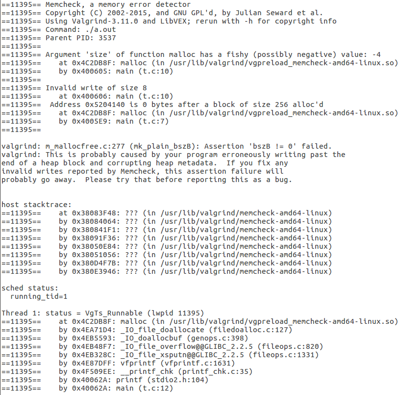 Jeśli program nie działa poprawnie, pojawią się odpowiednie komunikaty, np. „Aborted” („Zatrzymano”) lub „Segmentation fault” („Naruszenie ochrony pamięci”), i jego praca zostanie zatrzymana. Znalezienie źródła problemu jest możliwe dzięki następującej komendzie: