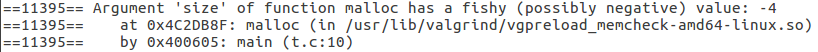 W tym przypadku wartość używana przez funkcję malloc() jest ujemna (-4). Rzeczywiście, w kodzie źródłowym, w linii 10. znajduje się niepożądany znak: