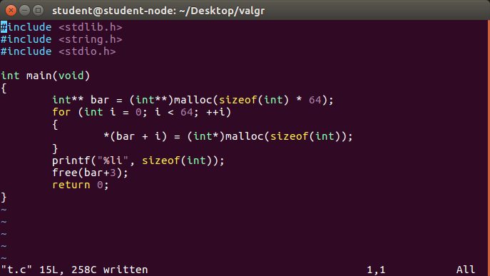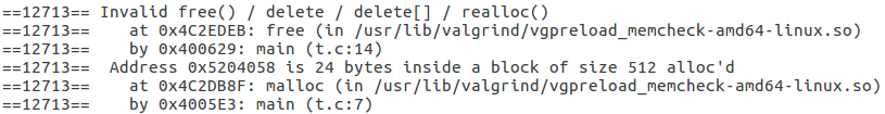 W tym przypadku do funkcji free() został wysłany niepoprawny wskaźnik na blok danych. Jest on przesunięty o 24 bajty w prawo, względem początku 512-bajtowego bloku („Address 0x5204058 is 24 bytes inside…”). Aby zaprezentować dodatkowe możliwości Valgrinda, tymczasowo usuniemy niepoprawną linię kodu.
