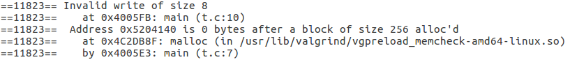 Valgrind pozwala na wykrywanie zapisu i odczytu danych w niedozwolonych miejscach. Błąd jest trudniejszy do wykrycia, ale ostatecznie okazuje się, że użyliśmy sizeof(int) zamiast sizeof(int*). Docelowo chcieliśmy utworzyć blok 64 wskaźników do zmiennej typu int, zamiast bloku 64 zmiennych typu int. Co ciekawe, ten błąd nie wystąpi, jeśli program bedzie skompilowany dla 32-bitowych systemów (ponieważ w takim przypadku int oraz int* byłyby takich samych rozmiarów).